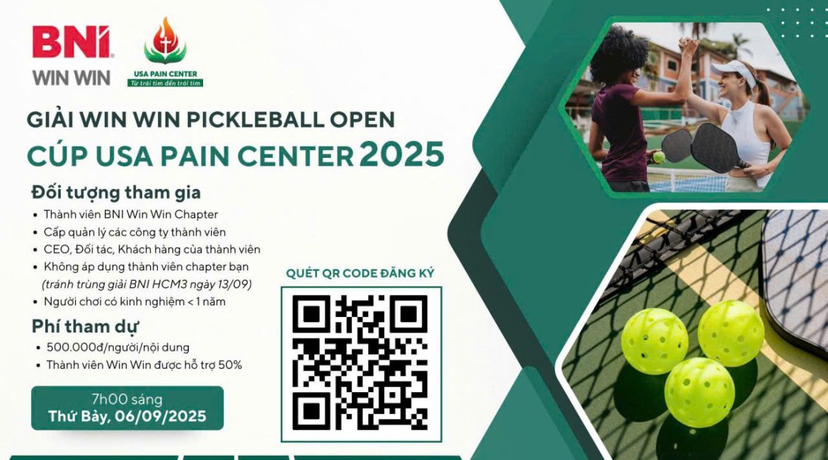 Ngày 06/09/2025, cộng đồng BNI Win Win Chapter sẽ chính thức khởi động một sự kiện thể thao đầy hứng khởi: Giải Win Win Pickleball Open – Cúp USA Pain Center 2025. Đây không chỉ là một giải đấu thể thao đơn thuần, mà còn là một sân chơi kết nối doanh nhân, nơi tinh thần thể thao, sức khỏe và cơ hội hợp tác được gắn kết trong cùng một trải nghiệm.